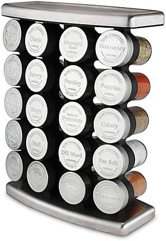 Find great prices on olde thompson 20 jar embossed revolving spice rack and other Spice Racks Organizers deals on Shop Better Homes Gardens. Olde Thompson 20 Jar Traditional Spice Rack Stainless steel 10 L x 5 W x 13 H Holds up to 20 spices PROP 65 WARNING. Allspice 11 oz Basil 04 oz Black Pepper 144 oz Cinnamon 125 oz Coriander 09 oz Cumin 12 oz Dill Weed 042 oz Ginger 10 oz Ground Fennel 10 oz Marjoram 025 oz Oregano 04 oz Paprika 12 oz Pink Salt 30 oz Red pepper 12 oz Rosemary 074 oz Sage 04 oz Savory 05 oz Sea Salt 332 oz Thyme 06 oz Turmeric 134 oz.