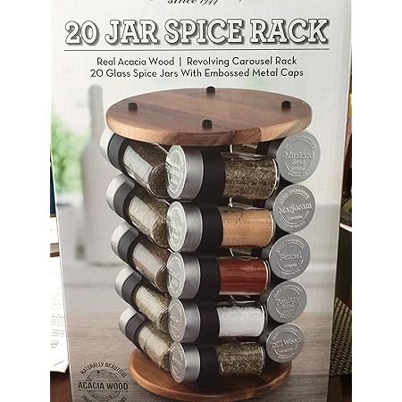 YouCopia 30-Bottle Spice Organizer. An acacia wood top and bottom surfaces lend a warm inviting touch to any kitchen. Olde Thompson 16-Jar Labeled Orbit Spice Rack Jars Rack 12-Jar Revolving Spice Rack Organizer - Spinning Countertop Herb and Spice Rack Organizer with 12 Glass Jar Bottles Spices Not Included Kamenstein Revolving 20-Jar Countertop Rack Tower Organizer with Free Spice Refills for 5 Years Silver.